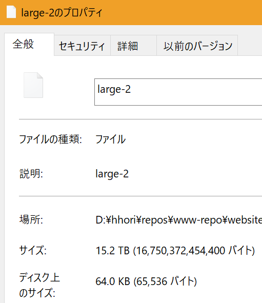 ディスクドライブよりはるかに大きいファイルです。エクスプローラのプロパティで見ると、実際には64KBしか消費していません。